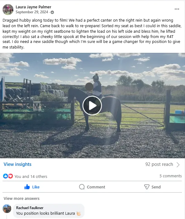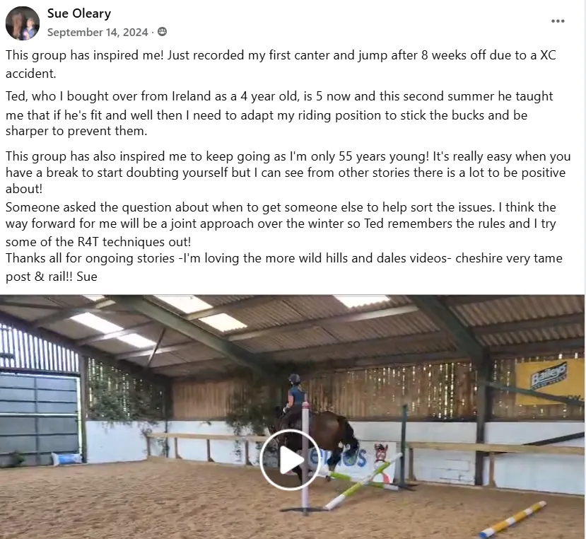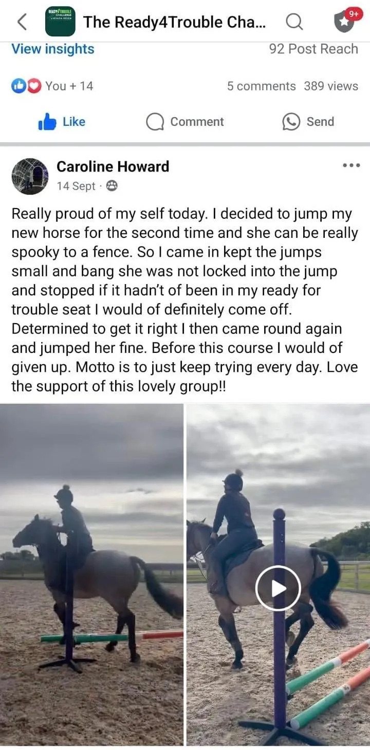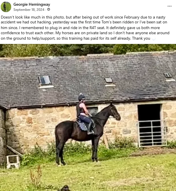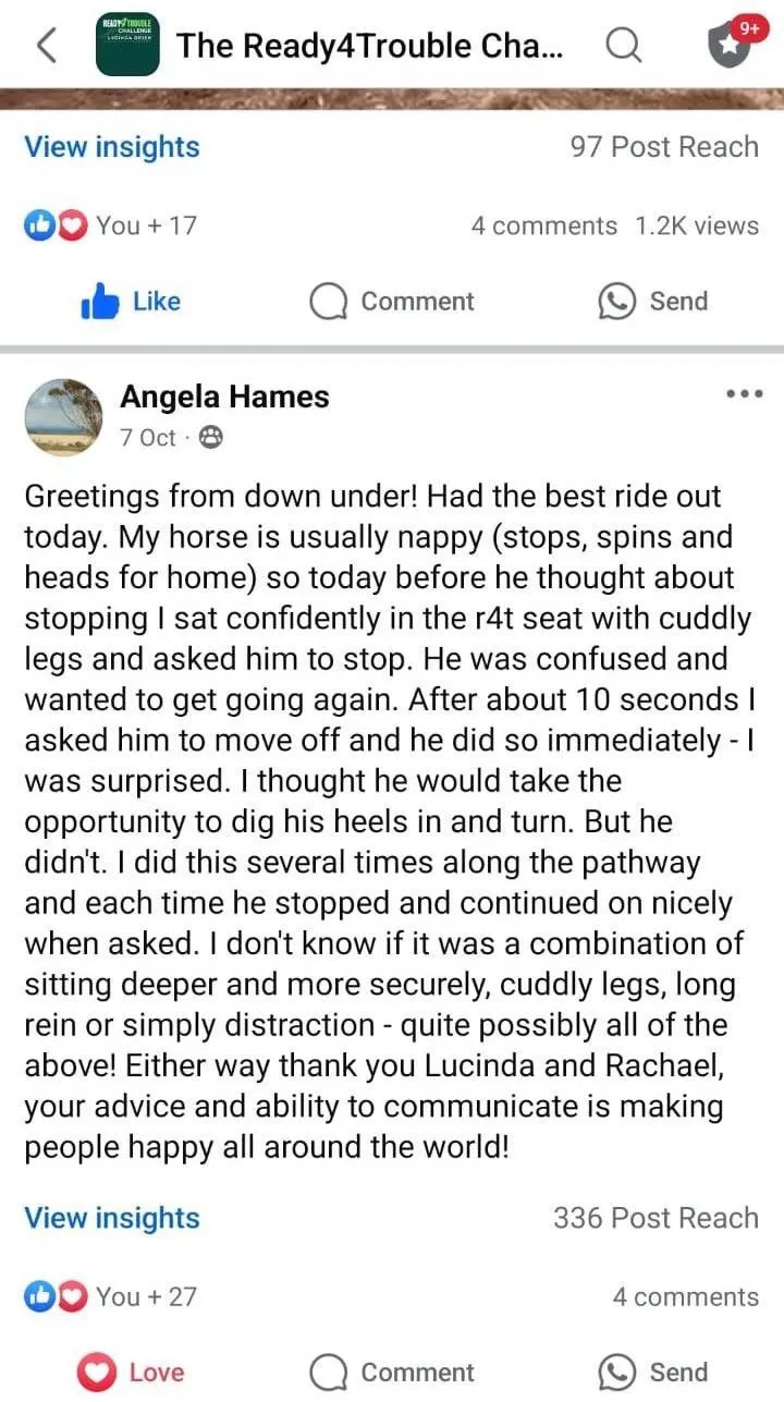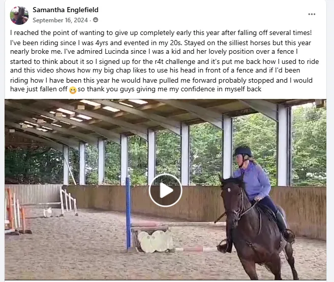 "I feel much safer and secure in my seat. My horse Greg too feels more confident underneath me, which I am convinced is solely due to what I have learnt throughout the tutorials R4T Challenge has provided".