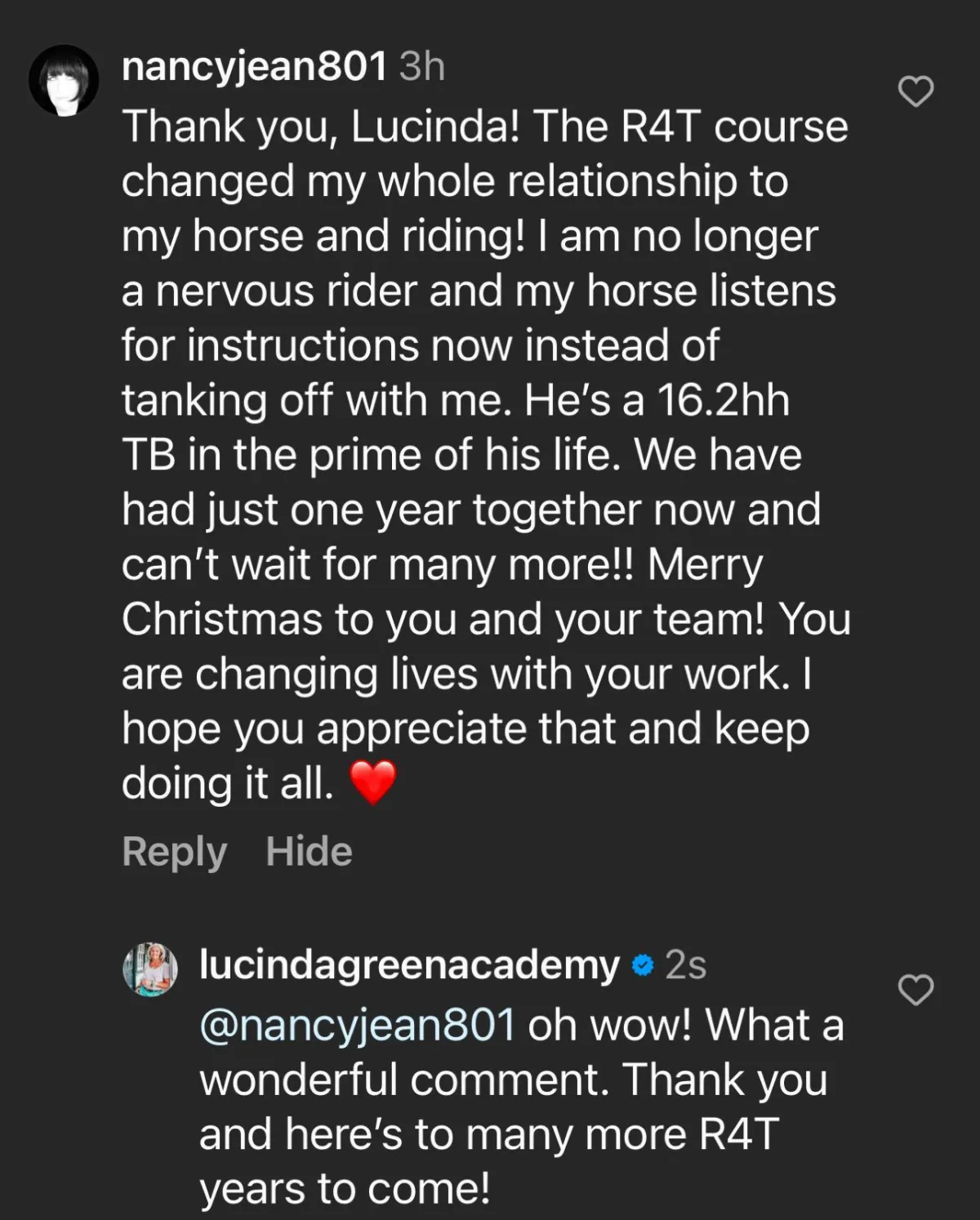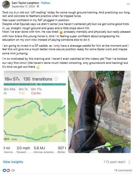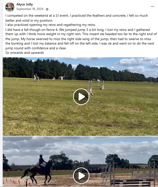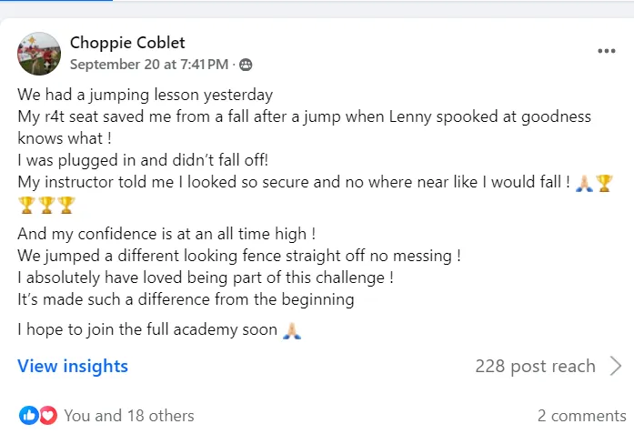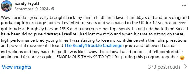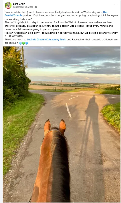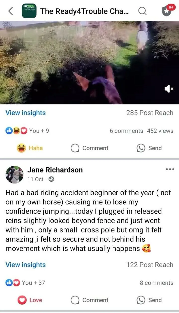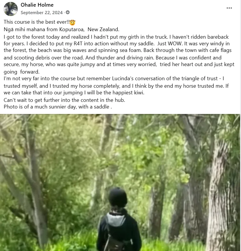 "I feel much safer and secure in my seat. My horse Greg too feels more confident underneath me, which I am convinced is solely due to what I have learnt throughout the tutorials R4T Challenge has provided".