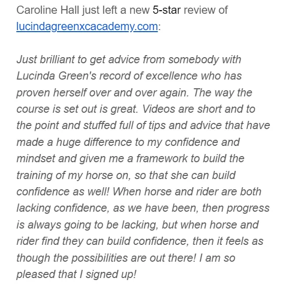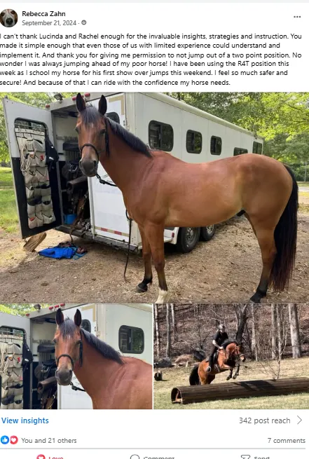 1) Personal Video Review – Submit a video of your riding, and Lucinda will study it in detail.